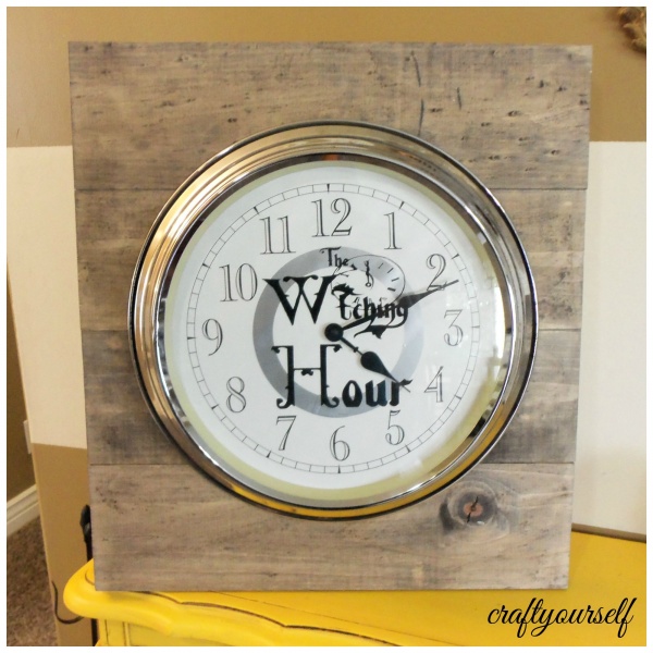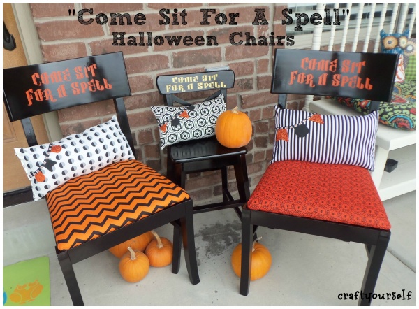 I knew I wanted to add the cute “Come sit for a spell” saying. I cut the phase out of orange vinyl using my personal cutting machine and applied it to the back rest of the chairs.