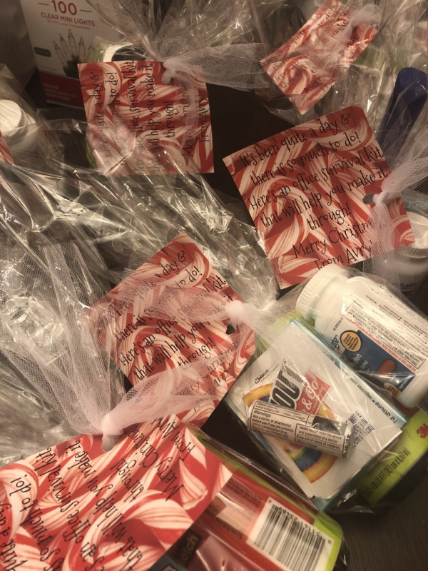 Figuring Co-workers already have pens, pencils, paperclips, highlighters etc. I stayed away from those items and kept to the items that they could just pull out of their desk. Normally something they do not have but do need. You could come up with all sorts of fun ideas for your own Office Survival Kit holiday gift.