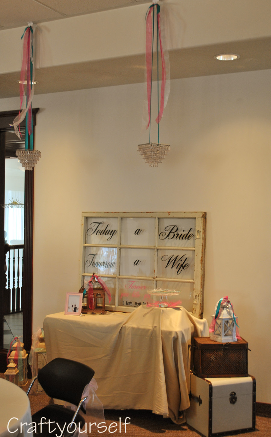 This next area was where her cake resided. I never got a picture of this completed with the cake and all.. so sad! Hopefully I’ll track one down. We took some old Chandeliers that Krystal found at a garage sale a few years ago that she was currently using in her own kitchen and suspended them from the ceiling on ribbon. We used the metal track hooks so there was no damage to the ceiling by using tape or push pins. 🙂 The table included an old window with the saying “Today a Bride, Tomorrow a wife, Forever your little girl” – I felt this saying was appropriate as Joey lived with her father and I know her dad would do ANYTHING for her. He absolutely adores his Joey girl! We added some trunks (from around our houses) and some lanterns. Myself, Krystal and her sister Kishell bought the lanterns 3 years ago at an RC Willey sale for $10 for all 3. So, we were able to use all 9 lanterns to match! The cake sat ontop of the glass pedestal cake stand. With a little burlap banner that read their wedding date. 🙂