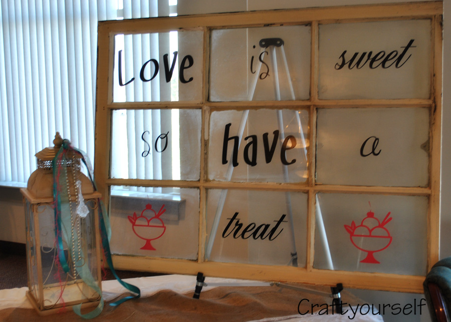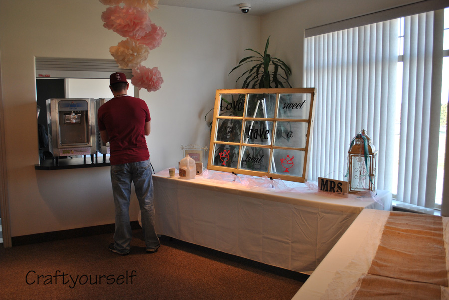 This was the dessert table and area – They served frozen yogurt with every topping imaginable! I took pictures BEFORE the event and although I am sad I missed out on a lot of photos during the event I am glad I took some before because I would have forgotten to during the party. The phrase on this old window says “Love is sweet so have a treat” Disclaimer: All old windows were obtained by Mike (Joey’s dad) a few years ago. He got them for free during a building tear down in Salt lake.