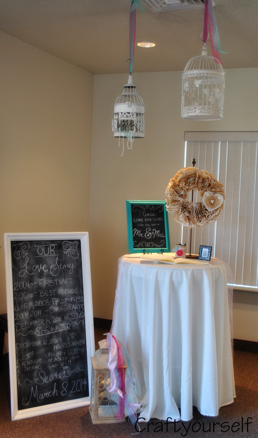 This area was set up as you came into the main doors. We used Krystals large chalkboard (which was the top of an old coffee table) We wrote a timeline of their love story. It was seriously cute! The chalkboard on the table was an old painted frame that said “Leave your wishes for the Mr. and Mrs.” I did a few of these frames. The other frame said to “Instagram their wedding using hashtag #mrandmrsfullmer”