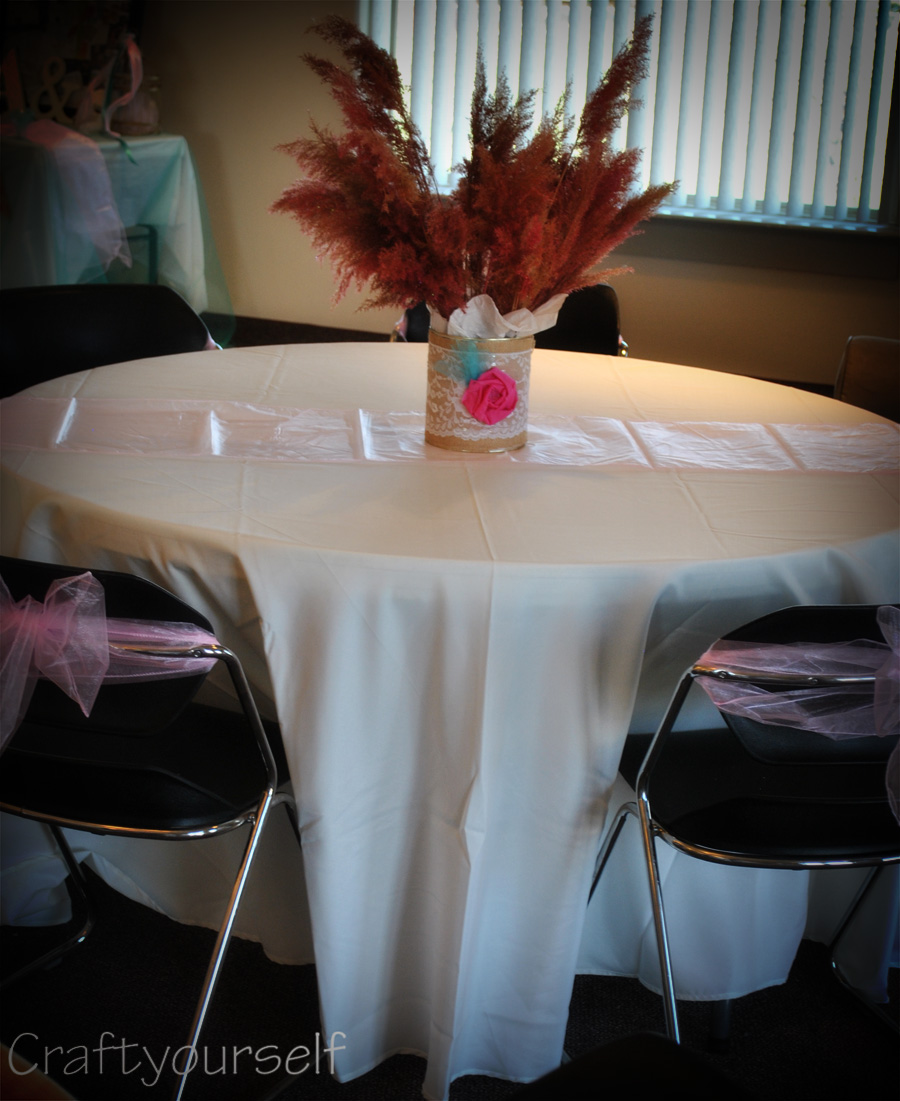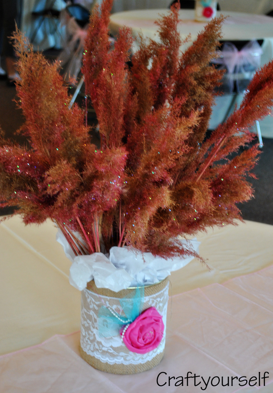 Oh the centerpieces. We (Krystal and I) gathered #10 can’s from the cafeteria at her mom’s school. Cleaned them out glued on burlap and thick lace. We took old scraps of bright pink and made rosettes – garnished with pearl strands and tulle. The feathered looking things coming from the centerpiece were probably the number one thing I heard about. Everyone said they loved the idea! The pictures do not do these centerpieces justice. Anyways Krystal and I found the cutest brown feather looking weeds along the sides of the road so we spent 45 minutes cutting down oodles of them. Took them home and spent another few hours spray painting them all and glittering them. They turned out so cute!