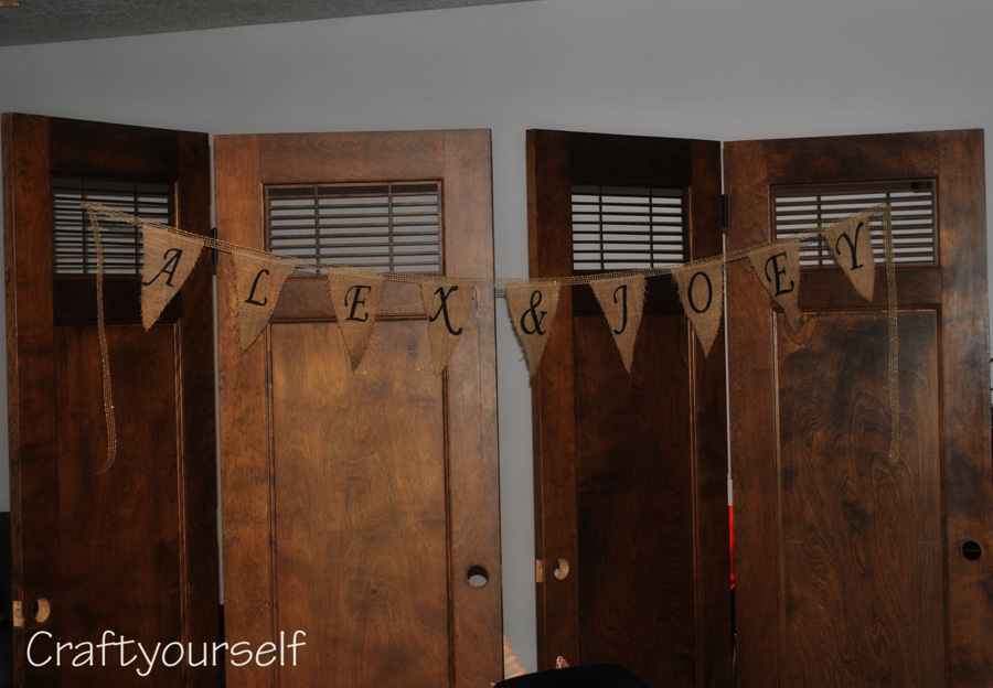 The old doors were hidden in Mike’s basement (Joey’s dad) So he put some hinges on them to create a backdrop. We made a banner with Joey and Alex’s name across it using just regular paint. Also used a lot of burlap for the shabby chic’ look.
