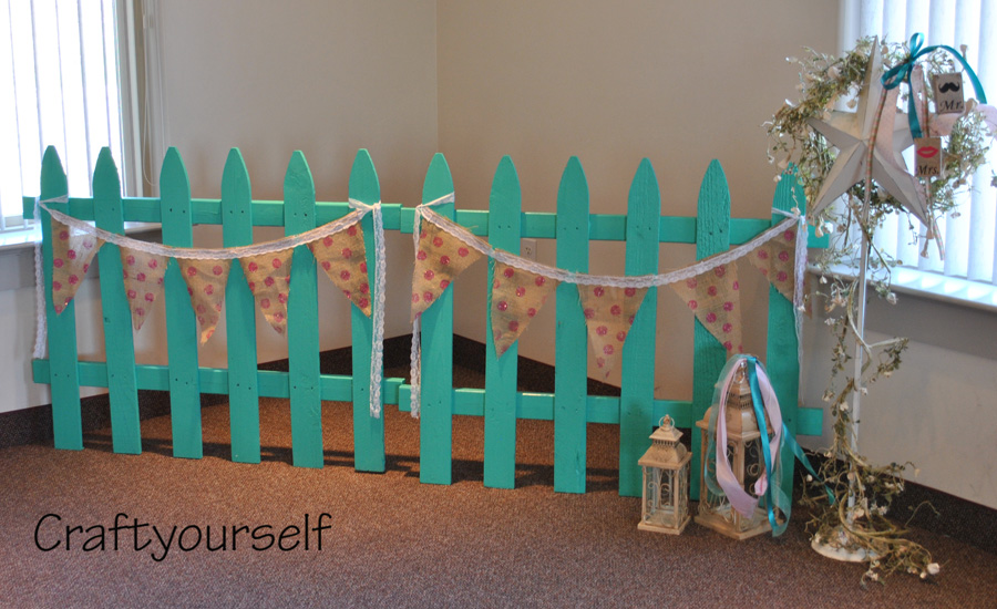 These picket fences were made last summer for Mine and Krystal’s front porches. (I have another post on my blog with them) Krystal made some cute polka dot burlap banners to string across them. Look closely at the cute little Mr & Mrs. Blocks on the star! Little additions like this added so much!