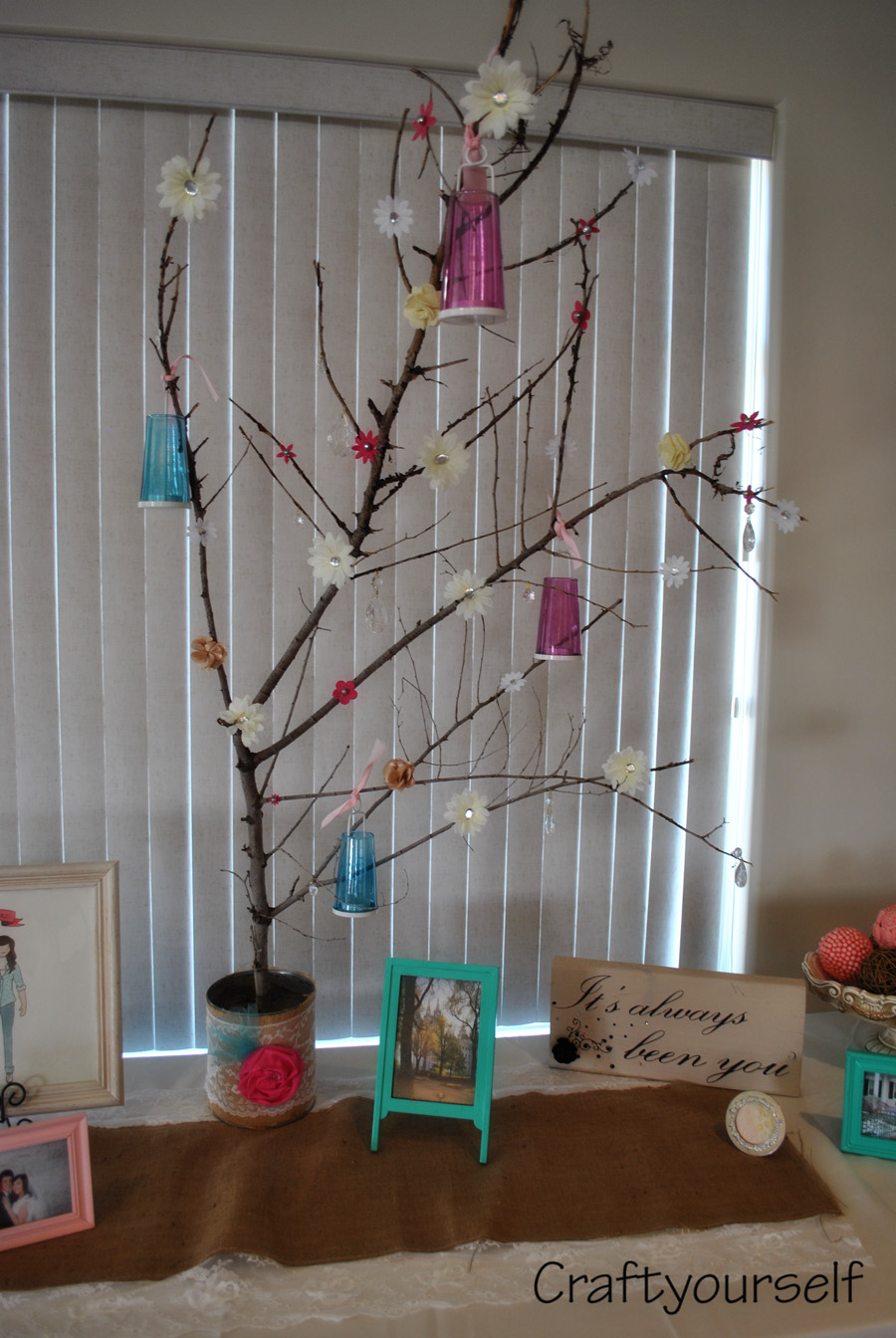 This wedding wishing tree was a 2:00 a.m. the night before the wedding creation. We took one of the wedding centerpiece cans and I poured in cement the day before to keep the large branch standing. It set up within 24 hours. We decorated the branch with little jewels, flowers and tea lights. I thought it turned out kinda cute!
