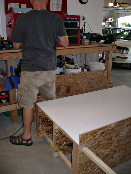 My hubby (also every craft woman’s dream man) caught on to the idea and went to town. He covered the outside of the stand in smooth finish beadboard and did the top in a slick piece also so the girls could wipe it down if lemonade got spilled. He put 2 large shelves on the back side so the girls could keep their money, cups, lysol wipes, extra inventory etc. on the shelves. He also built a canopy on the top to give them a little shade.