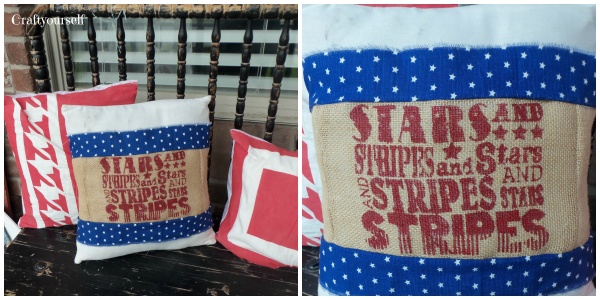 I saw this idea for a pillow sleeve over here at the polka dot chair. Pure genius I tell you!!! Why didn’t I think of this! I used her sleeve idea, I created my own design. I need a new 4th of July pillow cover. I came up with some 4th of July words and created a templet and cut it on freezer paper using my personal cutting machine. I ironed the freezer paper templet onto my burlap sewn sleeve. Next I painted my template red. After the paint was dry I removed the freezer paper! Now I have a quick new way to decorate my pillows!