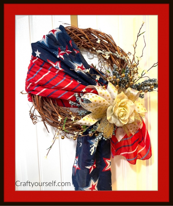 First, take a grapevine wreath, then wrap the $1.00 Dollar tree patriotic scarf around it. Second, embellish how you like by using ribbon, greenery or beads. Don’t be scared to take free items from people who are getting rid of stuff, from garage sales, thrift stores etc.