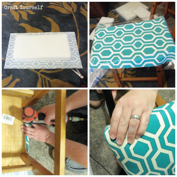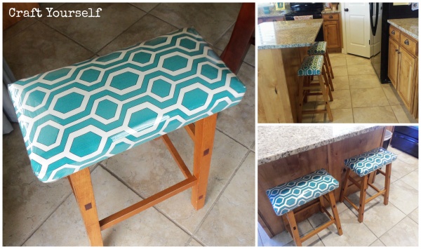 Mom my has had these saddle bar stools kicking around in her basement for a few years. I asked her if I could have 2 of them for this project. Next step was finding the perfect fabric. Originally in my mind I was going to recreate the exact same stool from Kohl’s. I went on the hunt to find some turquoise vinyl fabric. Once again I struck out there was no such luck in finding the color. While I was at Hobby Lobby I decided to rummage through the remnants bin. I found this darling geometric teal print. I fell in love with it. I grab the fabric remnant, clear vinyl and some foam and headed out to pay.