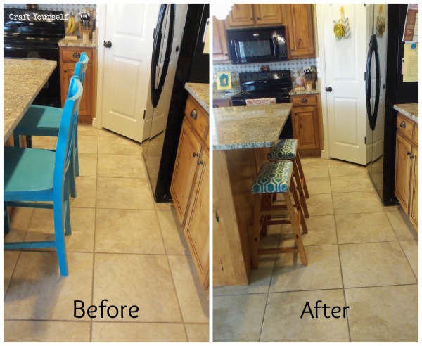 I love home improvement posts and this one is so great! I love the bar stools b/c they definitely look like they save space and are more practical, yet they are so fun with the turquoise cushioned seats! Congratulations on a great update!