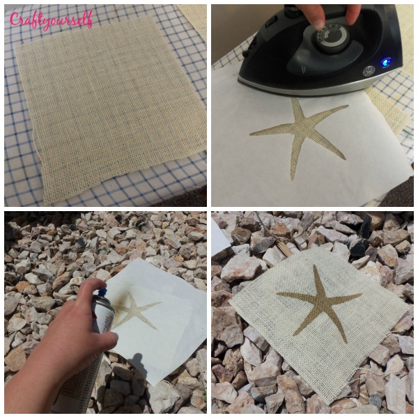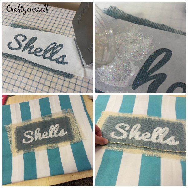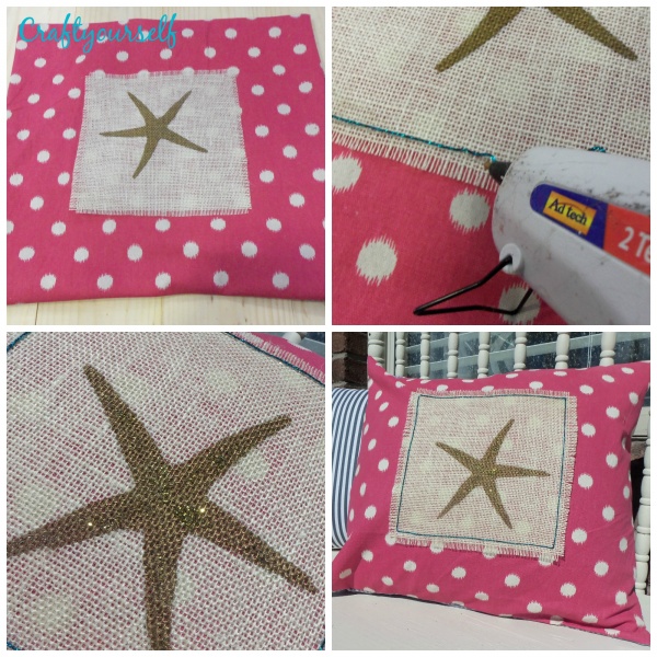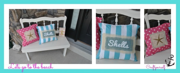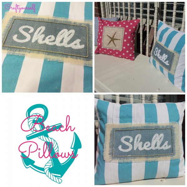 I dug through my fabric collection and found a few pieces of fabric that fit the look I was going for. I always make envelope style pillow covers because I like the concept of just making a cover it saves on space and time. Learn how to make an envelope pillow cover here. I began by cutting my fabrics and sewing the envelope pillow covers. Next I designed and cut the shell and starfish template out of freezer paper (using my personal cutting machine). I measured and cut cream colored burlap a little larger than the template I had. I ironed the freezer paper onto the burlap, painted the starfish with gold spray paint and sprinkled some gold glitter on while it was still wet. I painted the word shells with white craft paint onto blue burlap and sprinkled clear glitter on while it was still wet. I let them dry then peeled the freezer paper template off. On each piece of burlap I pulled a few strings of the edges and trimmed them even to give them a frayed look. I hot glued the starfish burlap onto the coral polka dot pillow and then hot glued a teal sparkly trim around the edge.