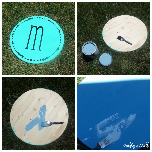 It was like fireworks went off!!! There was nothing on the backside of my round monogrammed initial! The next day I called Avry and told her to come over and bring her round board with her. We painted them a light blue color and white washed over top of it.