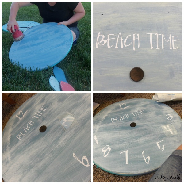 We sanded the edges after it was dry. Next I cut the clock number and Beach time out of white vinyl, using my personal cutting machine.