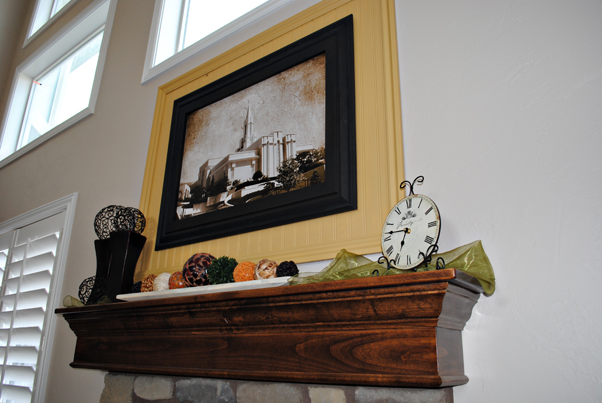 I have had a picture of the Bountiful Temple hanging above my fireplace for some time now. It was a picture that a good friend of mine did for me and gave me for Christmas a few years ago after I had gone through the temple. I have been wanting to add some color to my living room so I decided to somehow accent this picture with color.