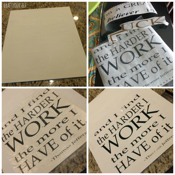 First we painted the boards white. While they were drying I set up the word template using my personal cutting machine. I chose to cut most of the wording out of a dark green vinyl. I knew I wanted the Luck cut in gold, because most of us associate luck with gold or riches. After the board was dry I applied the vinyl lettering and I was done!!! I know it’s a very simple board and craft project. I really wanted the quote to stay the focus of this craft project.