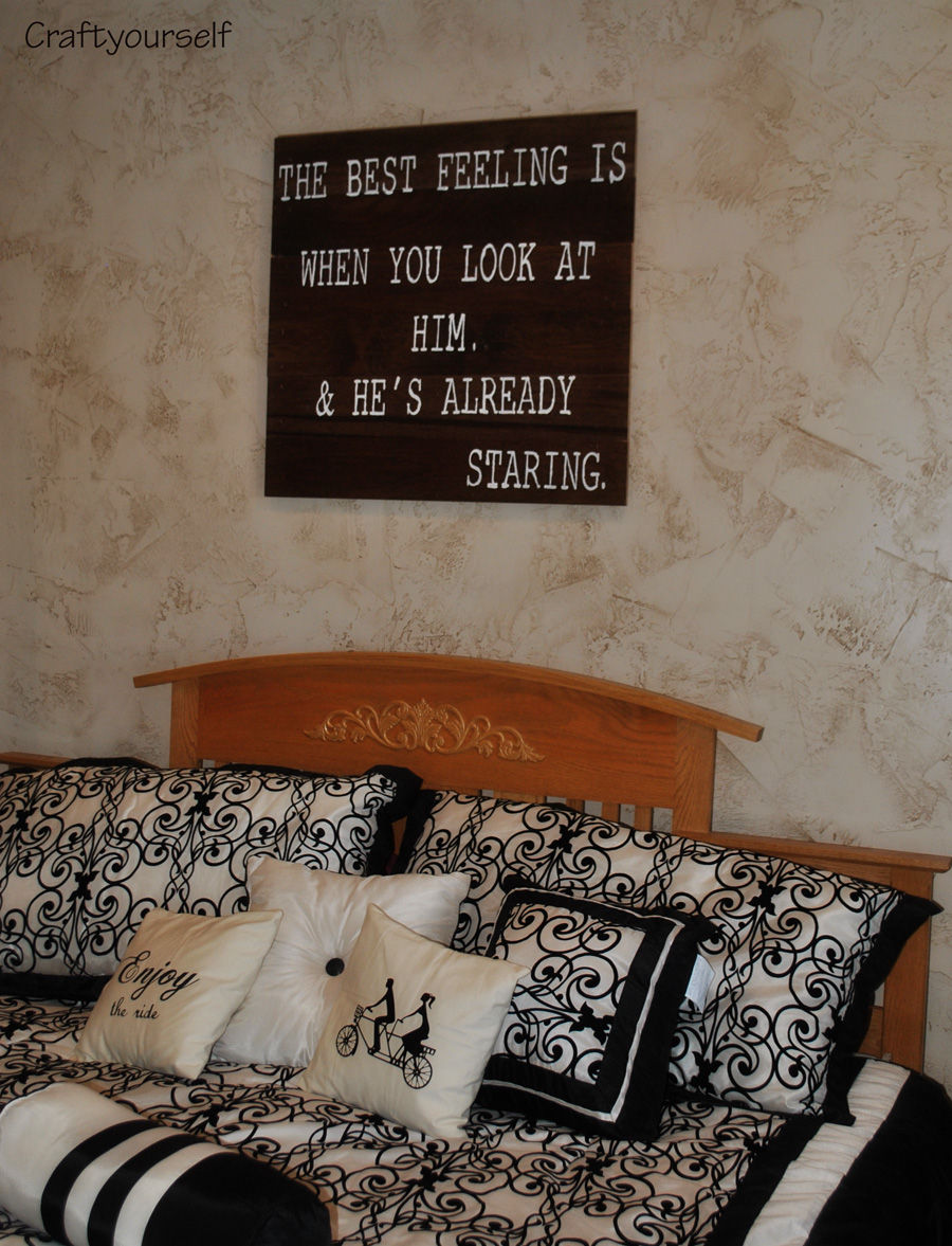 I saw the saying “The best feeling is when you look at him and he is already staring” and I loved it! I have to admit there have been a few times in my marriage that I will catch my husband looking at me, we make eye contact and then I can’t help but smile. It feels good to know he will look at me in admiration sometimes. When I made this next project I was somewhat worried he would think it was to “girly” to hang above our bed but I love that he accepts me and my crazy ideas.