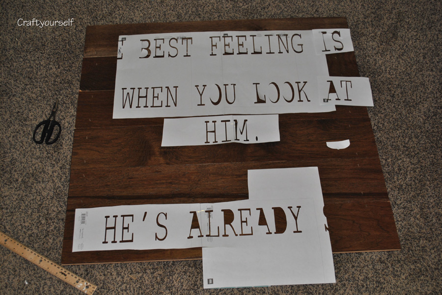 The template was made on the Silhouette in individual sections each section was cut using 12×12 pieces of scrapbook paper and just taped together. I picked the font to be somewhat blocky to have it look more uniform. Once the template was all put together I taped it down to the wood.