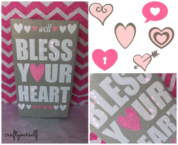 As I was wandering through a little gift shop, I came across a darling sign that read “well bless your heart”. I instantly knew this was a perfect little saying for Valentines day. I came home and got to work designing a template that I could cut and put on a board. I used some pre-cut scrap wood that I had laying around. I paint the boards gray and let them dry. Next I cut My saying out of white vinyl using my personal cutting machine. I applied the vinyl saying in the center of the board. It was still kind of plain and needed a little something. I decided to use pink glitter glue to highlight some of the hearts on the board. Here is another quick Valentines project to add to your craft list.