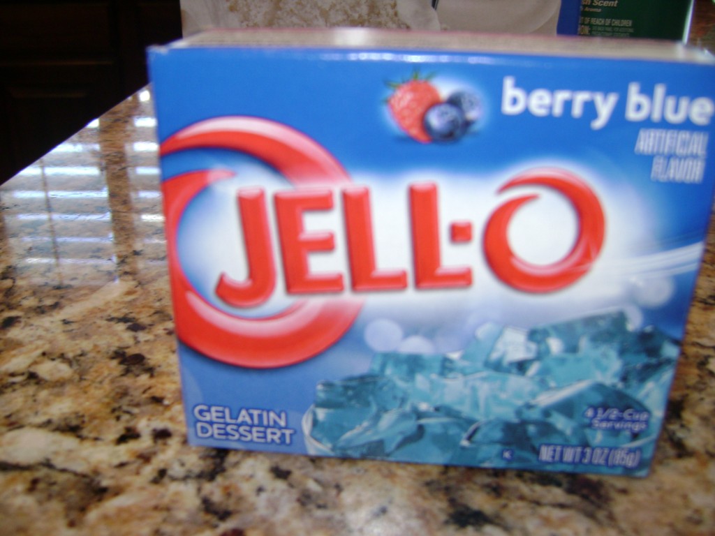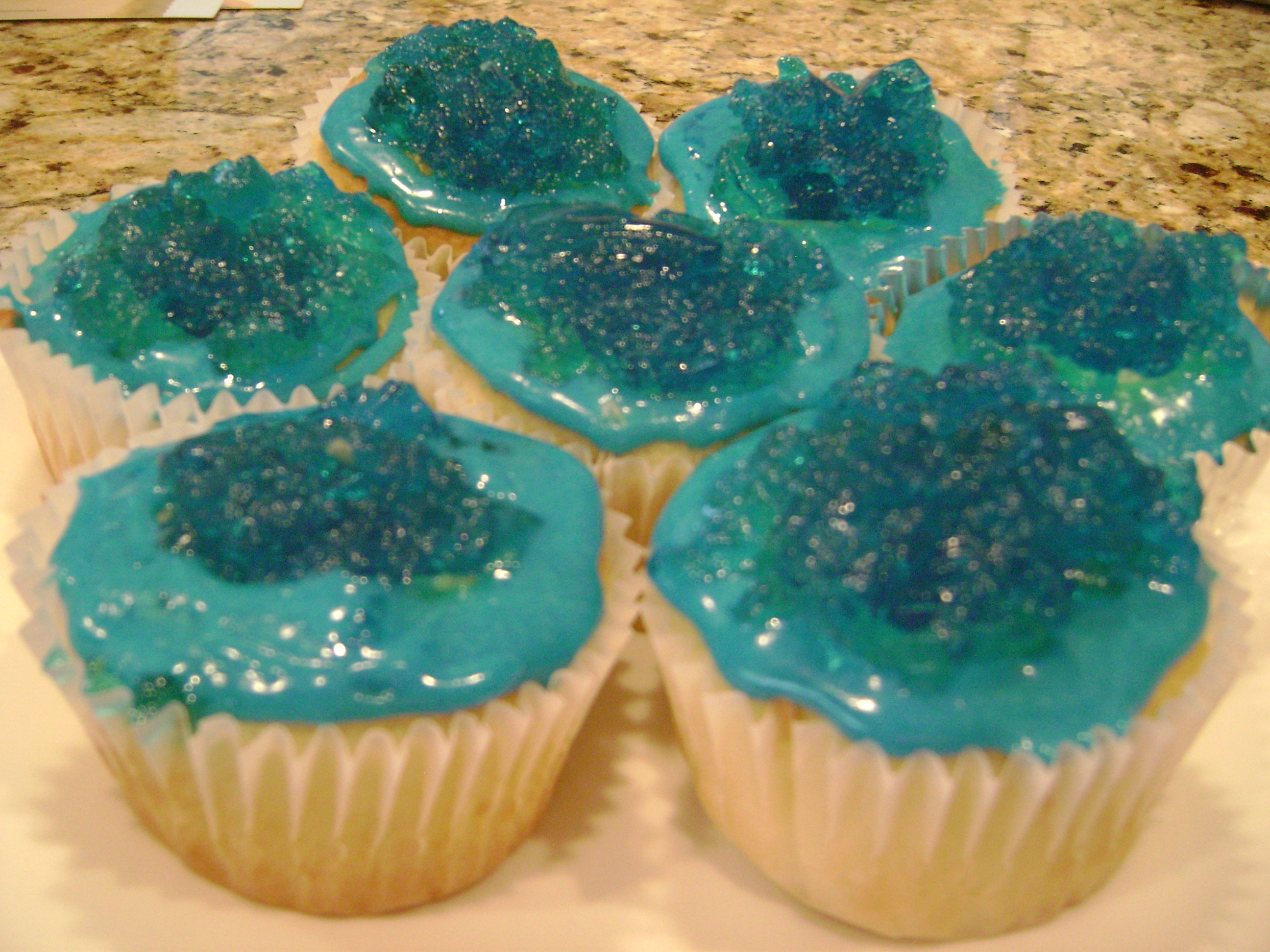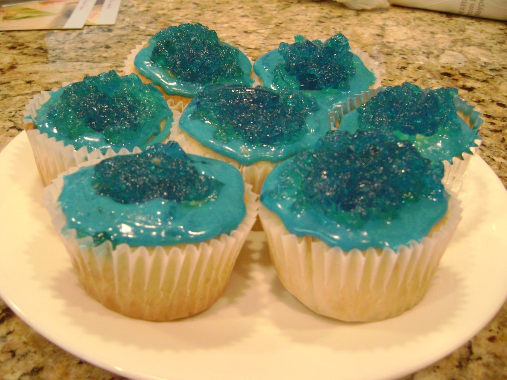- - Pipe ring of blue icing around edge of each cupcake. Spoon 1 rounded tablespoon gelatin mixture onto each cupcake. (I actually scooped a tiny bit of cupcake out of the center of each cupcake so the gelatin sat down in more)
