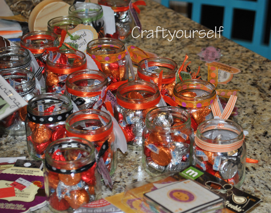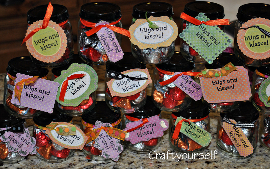 Get some old baby food jars, spray paint the lids black, add some Hershey kisses, a plastic spider or two, attach a cute tag that says “Bugs and Kisses” and Wha-La you have a quick party favor! (or a Halloween teacher gift, or a neighbor gift) The possibilities are endless on who you could give these to!