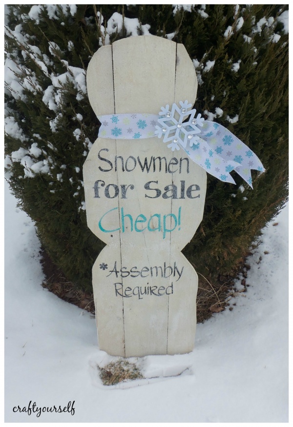 I am still not ready for Valentines yet! I have been having fun dreaming up ways to decorate in January. Here is the latest decoration that I have made. I saw something with the cute saying “Snowmen for sale Cheap! Assembly required”. It was just a plain old board. I loved the idea of snowmen for sale. I came up with this fun way to display it. To create my fun snowman sign. I used 3-4 pallet boards, I laid the boards next to each other and then free handed a snowman shape on them. Next I cut the boards using a jigsaw (it’s ok if they are not perfect…