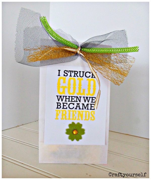 I love to make a small and simple craft or treat each holiday for friends and co-workers. I came across this easy St. Patrick’s Day gift idea over at Home Cooking Memories blog. I used her fun free printable and some small white lunch sack bags to create these Quick and simple St. Patrick’s Day treat bags. To create your own you will need: Small white paper lunch sacks Cardstock Free printable from Home Cooking Memories Blog Hot glue gun scissors paper cutter Ribbon and Embellishments Yellow and Gold packaged candy Start by printing Home cooking memories 4 per page St. Patrick’s Day printable onto Cardstock. Using your paper-cutter cut each…