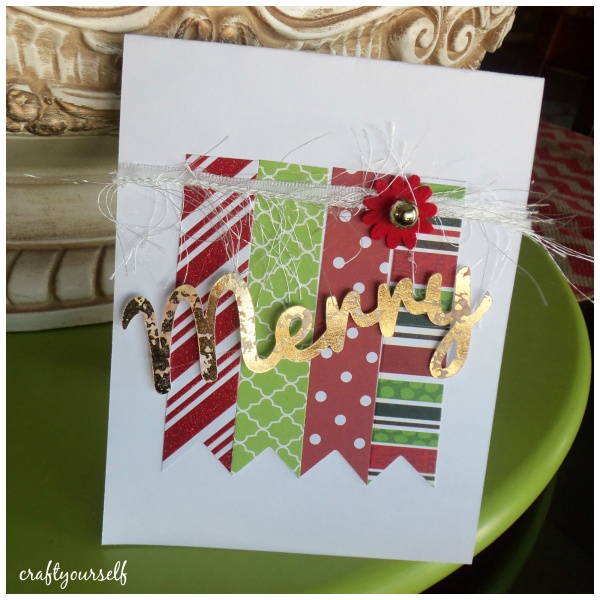 You know how Avry and I roll, we love to give handmade gifts and cards that have a personal touch. This year for our card group I chose to make this simple Merry card. Sometimes simple is the right answer. I love the balance of this card and how it all comes together. To make this card I started with white cardstock, I cut the card stock in half at 4 1/4 inches, then folded it in half to give me a card base that is 4 1/4″ X 5 1/2″. Next I selected 4 Christmas patterned papers. I cut 3/4″ X 4″ strips and clipped a V out of each…