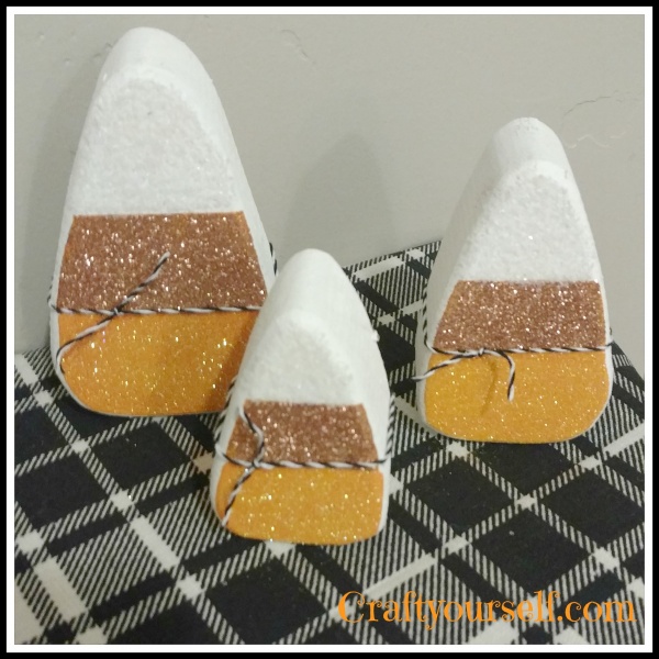 There are so many fun aspects of Halloween and one of them is candy corn! I love how there are different flavors of candy corn but rather than eating them what I like even better is decorating with them. While out garage saling one Saturday we found these great wood candy corn blocks. They were unpainted but ready to go! $1.00 for both sets wouldn’t be a price we would pass up. Sorry about the blurry pictures sometimes I’m not the best at remembering to take photos as I craft. Snapping a photo at the last second seems to be my specialty. It’s pretty easy to take a set…