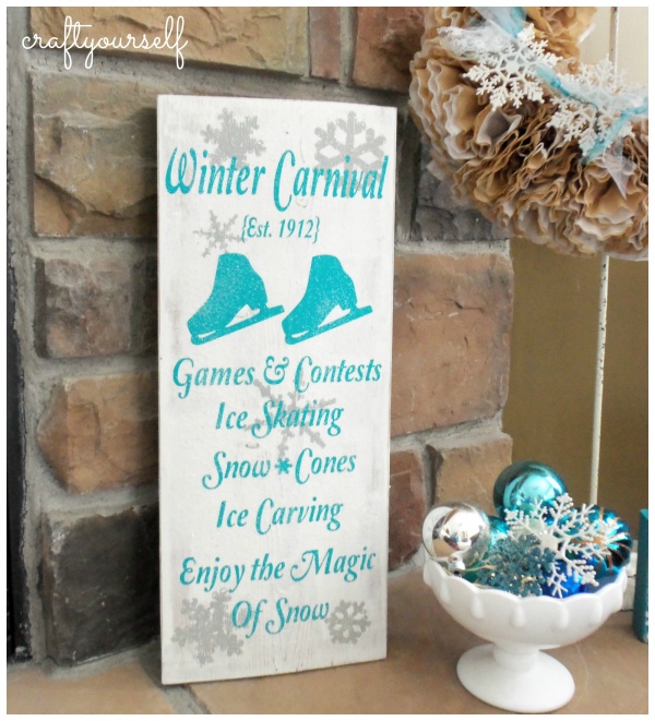 Here is another great way to decorate for January, using Ice Skates. Avry found several cute ideas using ice skates and then I jumped on the wagon and made up this fun little sign for Ice Skate Rentals. I started out with some old kitchen décor boards. They were in the donate pile and then I thought I could reuse those, I pulled them out and gave them a coat of gray paint. While they were drying, I set up a template with the wording and pair of ice skates. I cut the wording out of a teal vinyl using my personal cutting machine. I cut the vinyl about…
