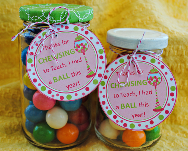 Teacher appreciation is next week in our school district and there are soo many cute ideas floating around the web right now. I really like this one and made up a few cute jars for my daughters teachers. I found the printable at Crystal & Co. I printed a few out on cardstock. Then I took some old jars & painted the lid on one and modpodged scrapbook paper onto the lid of the other one. I filled the jars with gumballs and used baker’s twine to put the cute little printable in it’s place! Super fast and cute idea! Thanks Crystal & Co. for sharing such a cute printable!