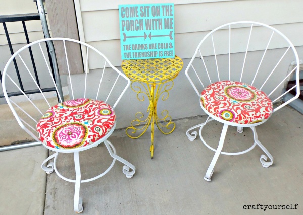 My parents had this darling vintage patio table with patio chairs. The is a glass table with white iron chairs with yellow vinyl cushions on them. They had purchased this patio set at a yard sale several years ago. After many sunny summers and long hard winters the yellow vinyl finally deteriorated. My dad had put all of the chairs in his truck to take them to the landfill. While looking them over I see that the metal frame on the chairs is in great shape and can easily be painted. Knowing I could figure out something for the seat I asked my dad to bring the chairs to my…