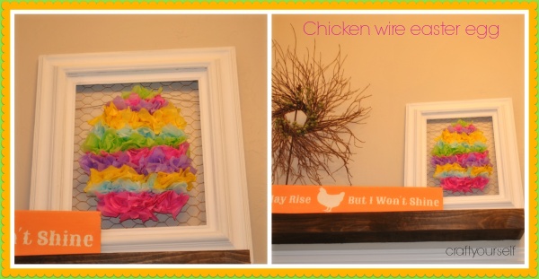 Originally I saw a an ideas for this chicken wire frame on Studio 5. They had made a heart for Valentines day, and had done it using ribbon. I thought this was a great idea and that an egg shape should be pretty simple to make. I gave it a go using strips of ribbon at first. It turned out horrible!!!! you couldn’t even tell that it was suppose to be an egg and the colored ribbon didn’t go well together. I was totally bummed!!!! Then one day, while I was on a pinterest bindge! this similar idea showed up in my feed. I loved how she used napkins!!! yes napkins to create her image. After I saw how she made hers, it just clicked for me. The ribbons were such a long tedious process. The napkin idea was so simple!