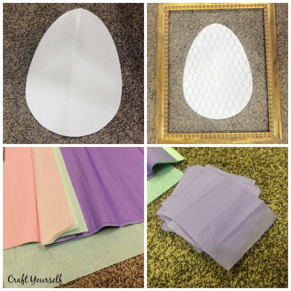 First I cut the chicken wire to size of the opening of my frame using some wire cutters. Then I hot glued the chicken wire on the back of my frame. I made sure to cover each prong/wire point, with hot glue. This way there will be nothing poking out to scratch you or your door. I taped together a few sheets of printer paper and made an egg template. Then I laid my frame over the egg template. I cut several layers of the tissue paper into about 4″ by 4″ squares. They don’t have to be perfect.