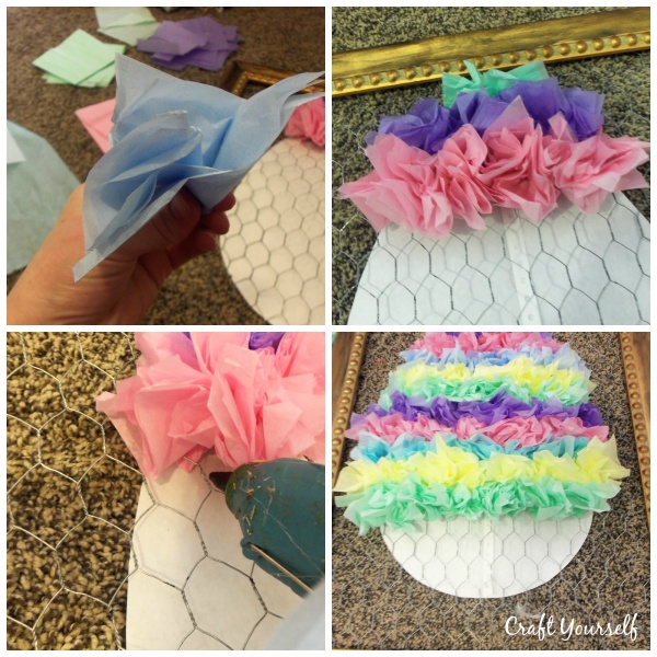 To start off making this project I gathered a large frame I had purchased at a garage sale last summer for .25 cents (what a deal). Then I went dumpster diving at one of the many construction sites by my home. They generally use chicken wire when they are doing stucco on a home. So, I knew it would be easy to find a scrap of chicken wire. Next, I went to the dollar store to pick up colored napkins. While I was shopping I realized that I didn’t want to buy 5 different packs of napkins to get the variety of colors. So, instead I decided to buy a pastel multi-colored pack of tissue paper.
