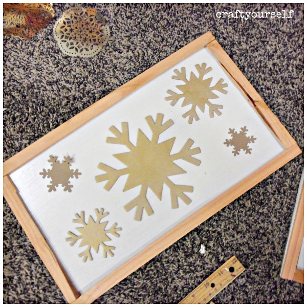Begin by painting your thin wood board white and allowing for time to dry. Glue wood trims around your board using a hot glue gun. glue chipboard snowflakes in the desired pattern in the center of your board.
