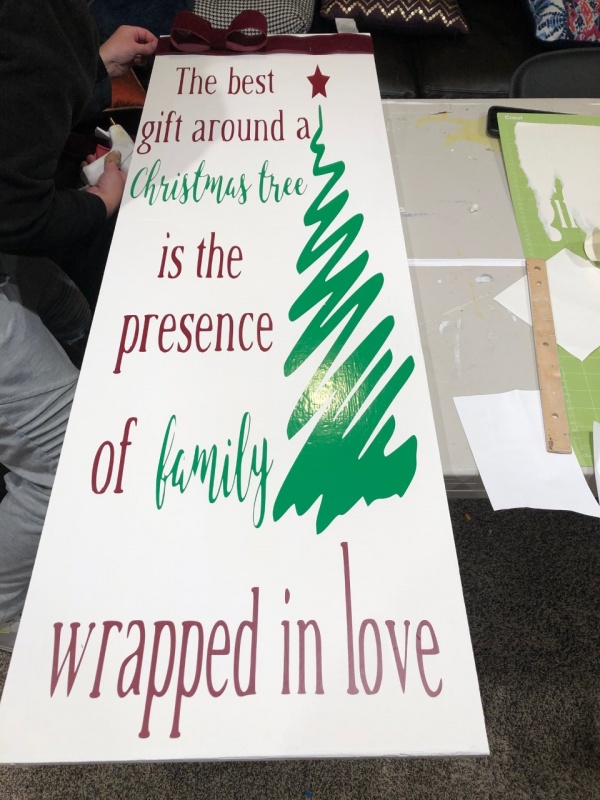 Finally, along the top of the sign you can see we added some velvet burgundy ribbon and to add a little embellishing to the top. I knew exactly where this sign was going to go! Right on my mother’s front porch. I couldn’t wait to surprise her. This Large Four Foot Christmas Tree Family Décor sign was made for my mother in 2019 and has been displayed for several years.