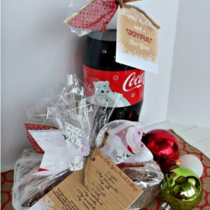 Tie jute around the top of your Coca-Cola bottle, add additional ribbons and Joyful tag tie in place with jute.