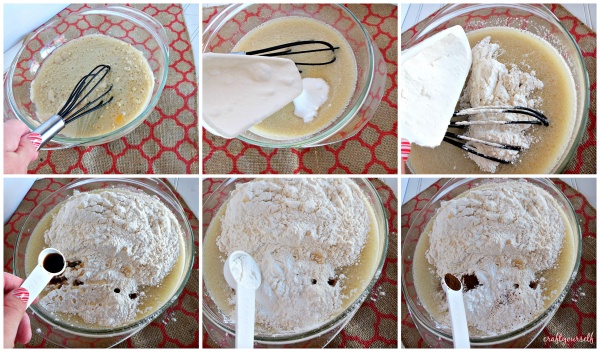 Mix the wet ingredients together with a whisk. Next add 2 cups sugar, 4 cups flour, 1/2 teaspoon ground cloves, 2 tablespoons baking powder, 2 teaspoons cinnamon, and 1 teaspoon salt.