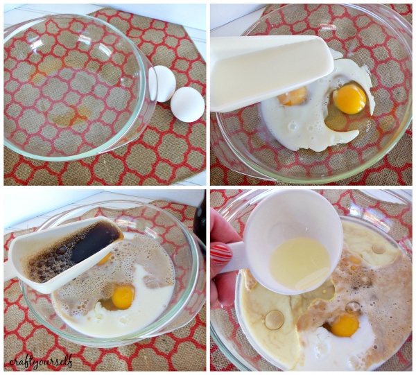 To make your own Coca-Cola holiday spiced bread with glaze, In a large bowl add 2 eggs, 1 cup milk, 1 cup of Coca-Cola, and 2/3 cup of vegetable oil.