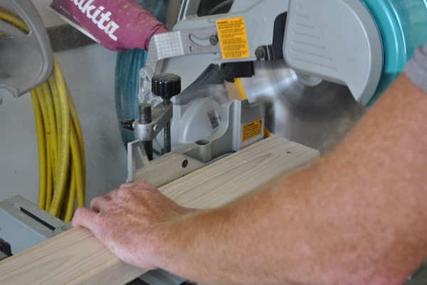 Cut two pieces of pine (using a chop or hand saw) into 5″ by 3 1/2″ strips.