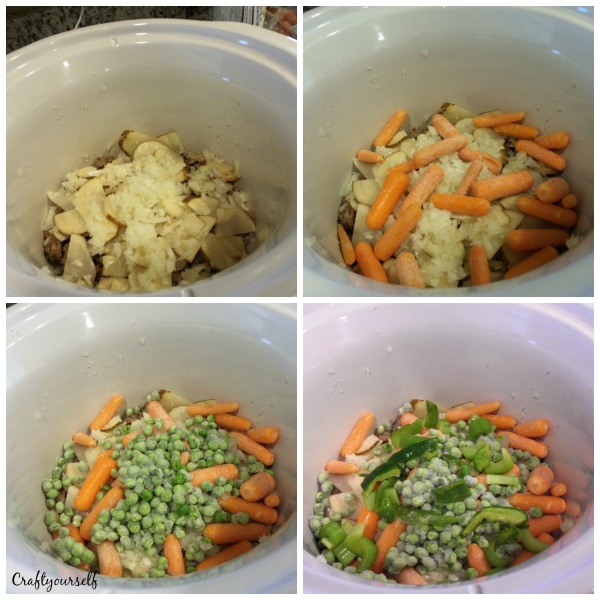 This recipe does take about 20 minutes to prep. First start browning your pound of hamburger and while the hamburger is cooking you can use a food process to speed up the chopping process. I use it to chop my onions, celery and potatoes. I don’t peel the skins off my potatoes for this recipe. I also buy the bags of baby carrots and throw them in the crock pot whole. After my hamburger is browned and all veggies are chopped. I layer them in the crock pot, starting with the hamburger on the bottom then potatoes.