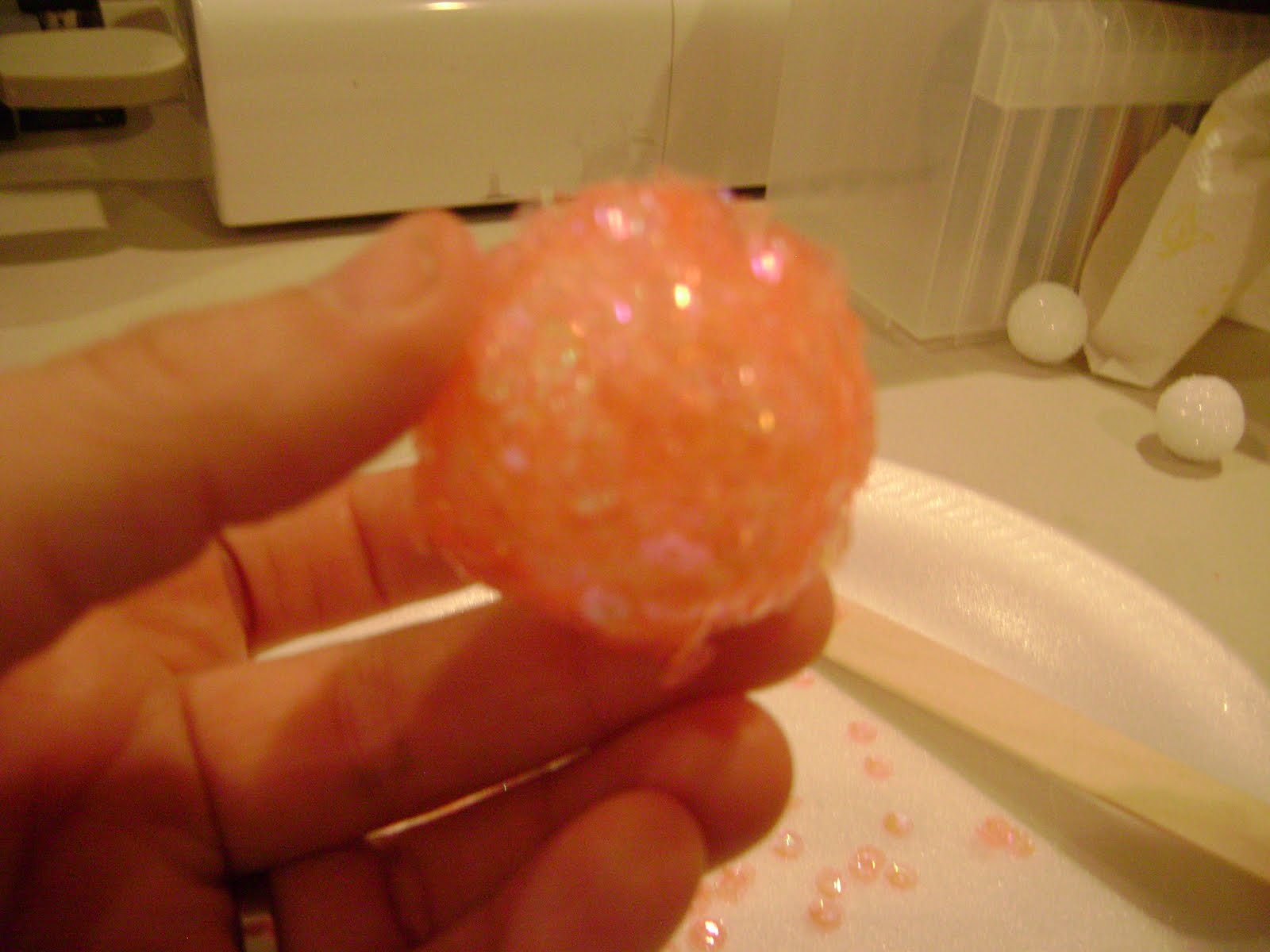 The next ball I wanted to try was one using sequins.. HA that was a joke! At first I tried tacky glue and just tried rolling the ball in the sequins but that made a mess and the glue started seeping into the ball so I would have to add more then it looked like a big glue glob. Frustrated I threw the first ball into the garbage and decided to try hot glue.. BLEH just all around frustrating. I did get one tiny ball made and gave up on the glitter idea. Any crafty girls out there that know how to make those sequins balls without it turning into a mess I would LOVE your advice!