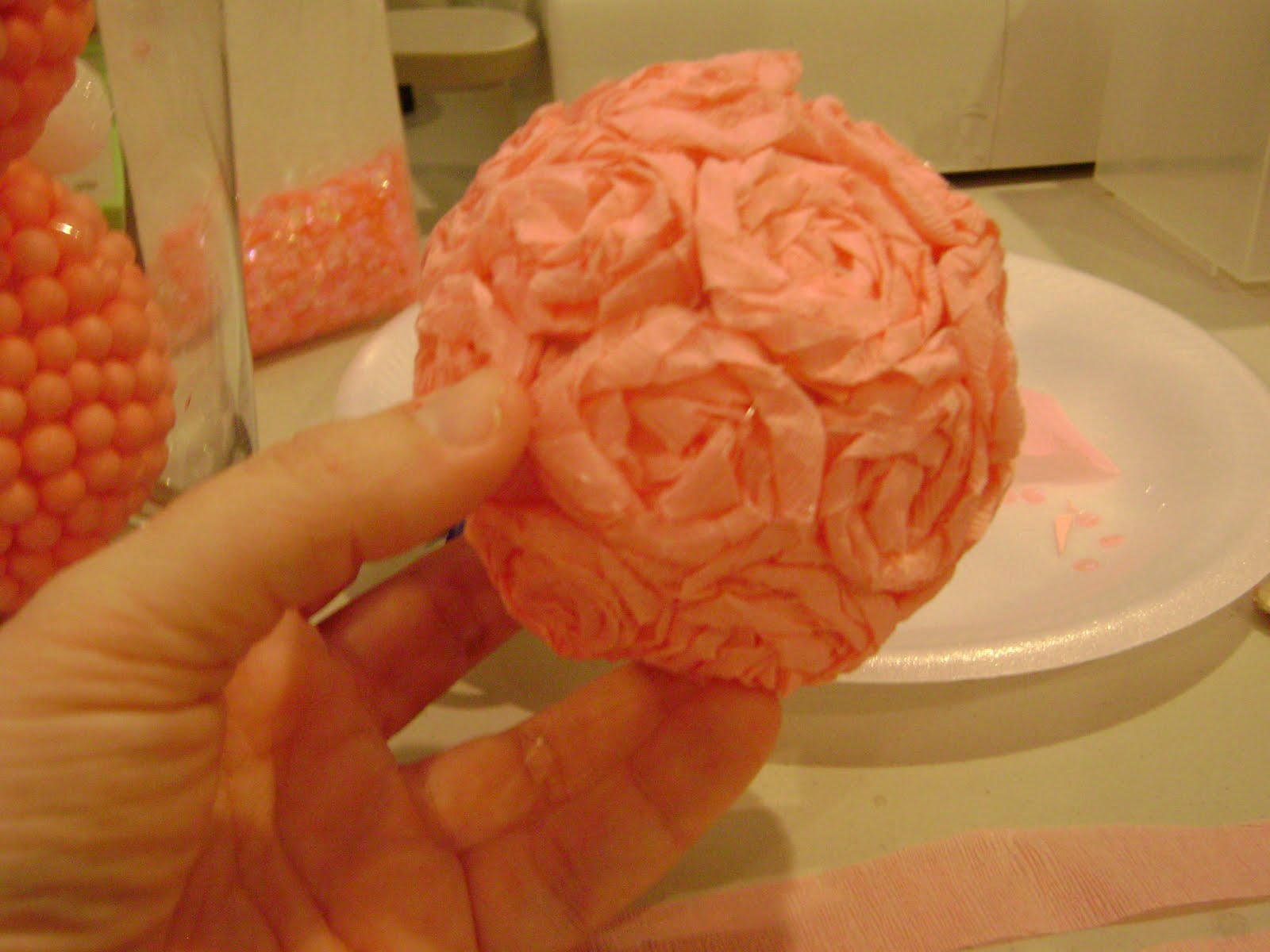 Last but not least my favorite!! I tried to find a tutorial on this one because I know I saw these done somewhere I just cannot remember where I saw them. Crepe paper rosette ball. I learned how to make rosettes out of fabric and decided to try it using crepe paper. I made one rosette and decided it was very large and realized if I made smaller one’s I could probably glue them to a ball too! So I cut Crepe paper about 8 to 10 inches long and sliced it down the middle then went to town making rosettes and glueing them onto the ball. I already had the crete paper so this was a cheap craft. Although it was very time consuming it turned out darling!