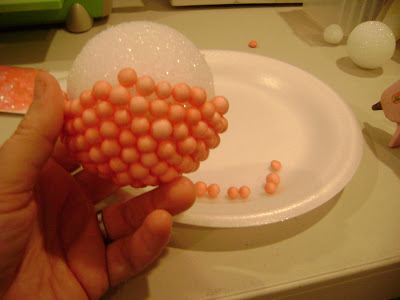 First Ball – I found this entire canister of little foam beads at Tai Pan trading for $2.00 I made 2 balls and it didn’t even dent the canister. SO I decided I could always make more of these balls and spray paint them different colors! They don’t always have to be pink. I used a large foam ball and hot glued away. These balls came together really fast.