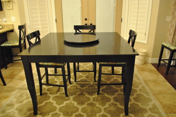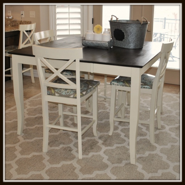 I don’t have money in the budget for a whole new dining set so I chose to redo my dining room table. This redo gives me a bit of a boost and a small face lift to my home. Here is the before picture of my lovely dining room table. – As you can see in the picture I had already redone the cushions on the chairs and tried to lighten things up with a lighter rug. Bleh. just plain Bleh.
