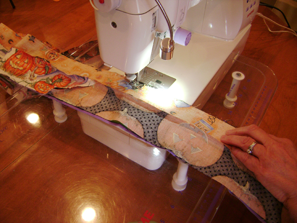 4. Here is the hardest part of the whole quilt top. Bring the two ends together- right sides together without twisting the strip. Sew the long sides together (see picture) Your strip will now be 2 strips wide and about 350 ” long.