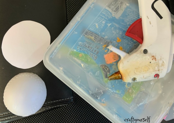 Next, trace around half of your ball onto cardboard. Cut out the cardboard circle leaving a 1/8″ larger than the ball. glue the half-cut ball onto the cardboard using your hot glue gun.