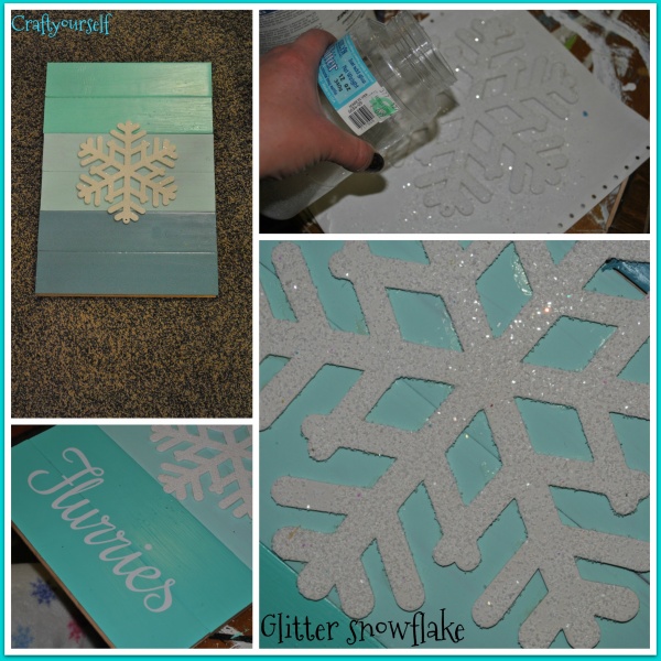 After paint dried we glued all 6 slats together and let them dry. The overall dimensions came to 12″x 18″ Krystal had a few wood laser cut Christmas pre-cut snowflakes that we painted white and glittered to put in the center of the sign.