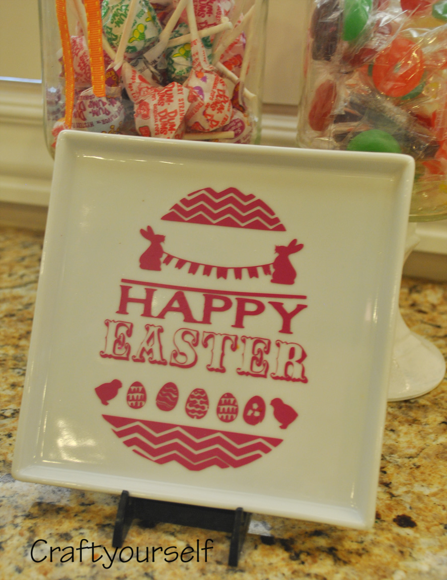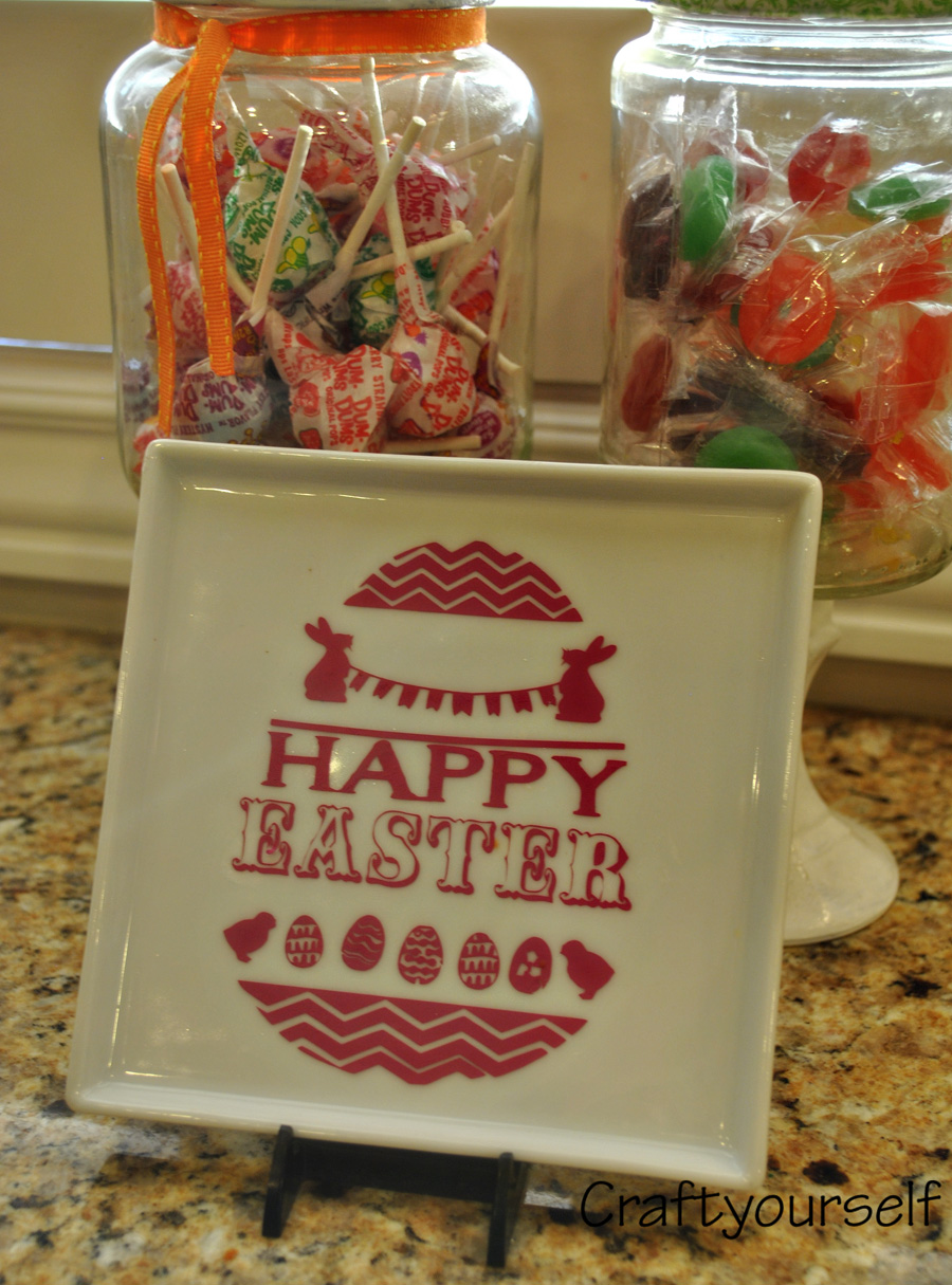 The Egg was found on Google Images and didn’t have a link to the creator. Took the image and used it on the Silhouette to cut. I used a dark pink vinyl and put the end result onto the cute little square dishes!