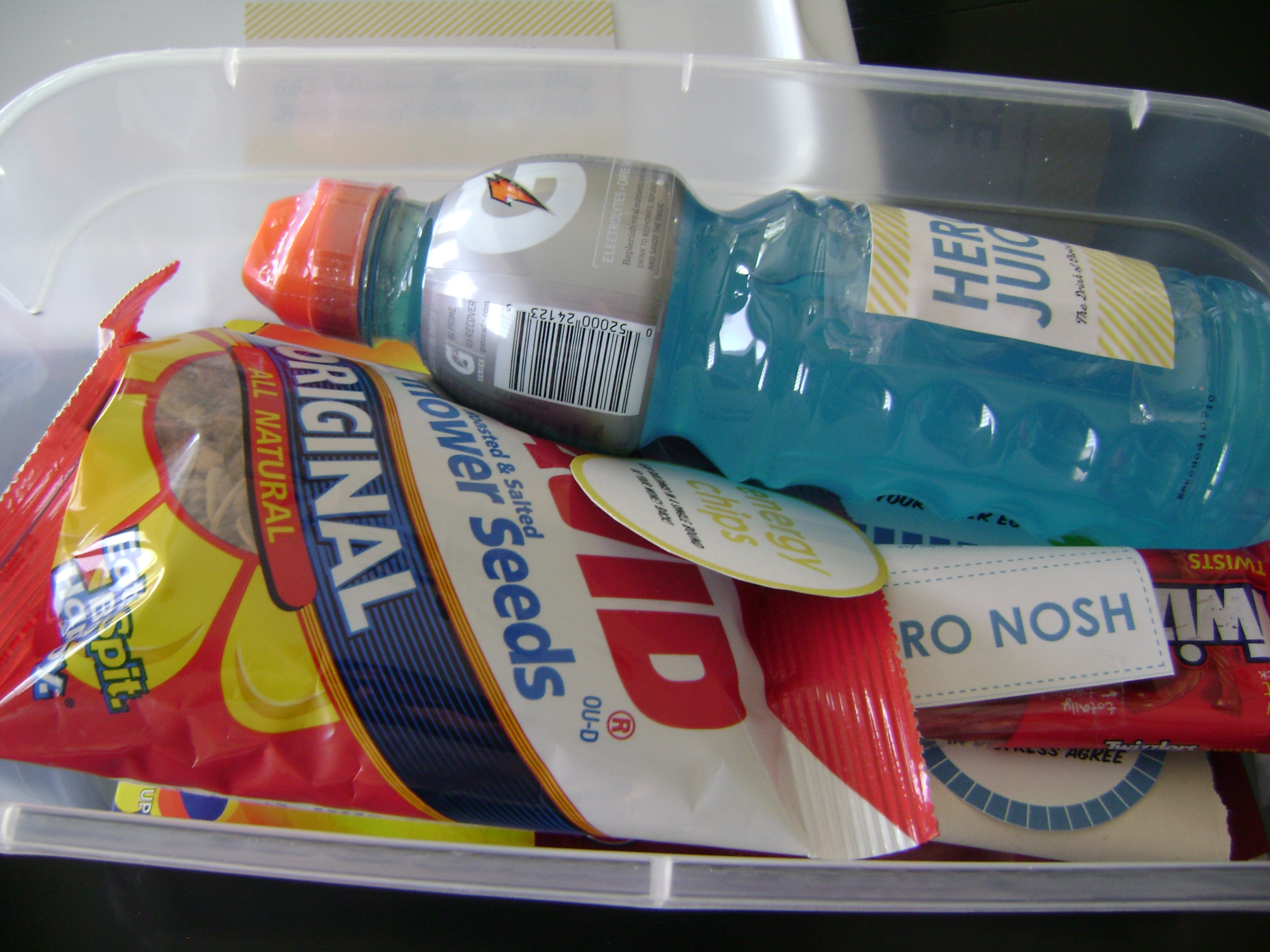 Simple treats like a drink, jerky, a candy bar, gum etc work great so you can attach your labels to.